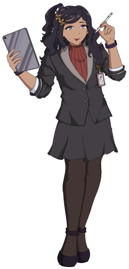 | Her work attire consists of an above-knee length skirt, a red turtleneck blouse underneath, and an identical ash black business jacket. In addition, she has a black wristband on each wrist. Her usual dark stockings along with black shoes with a thick ankle strap. |